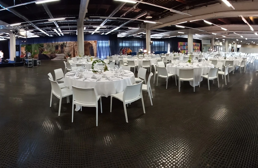 Grâce à son espace dégagé et à ses hauteurs importantes, il autorise des implantations techniques variées : stands de grande dimension, structures scéniques, gradins, dispositifs audiovisuels ou scénographies immersives. Il convient aussi bien à un événement de 300 à 600 personnes qu’à des manifestations de plus grande ampleur nécessitant surface et fluidité des flux.